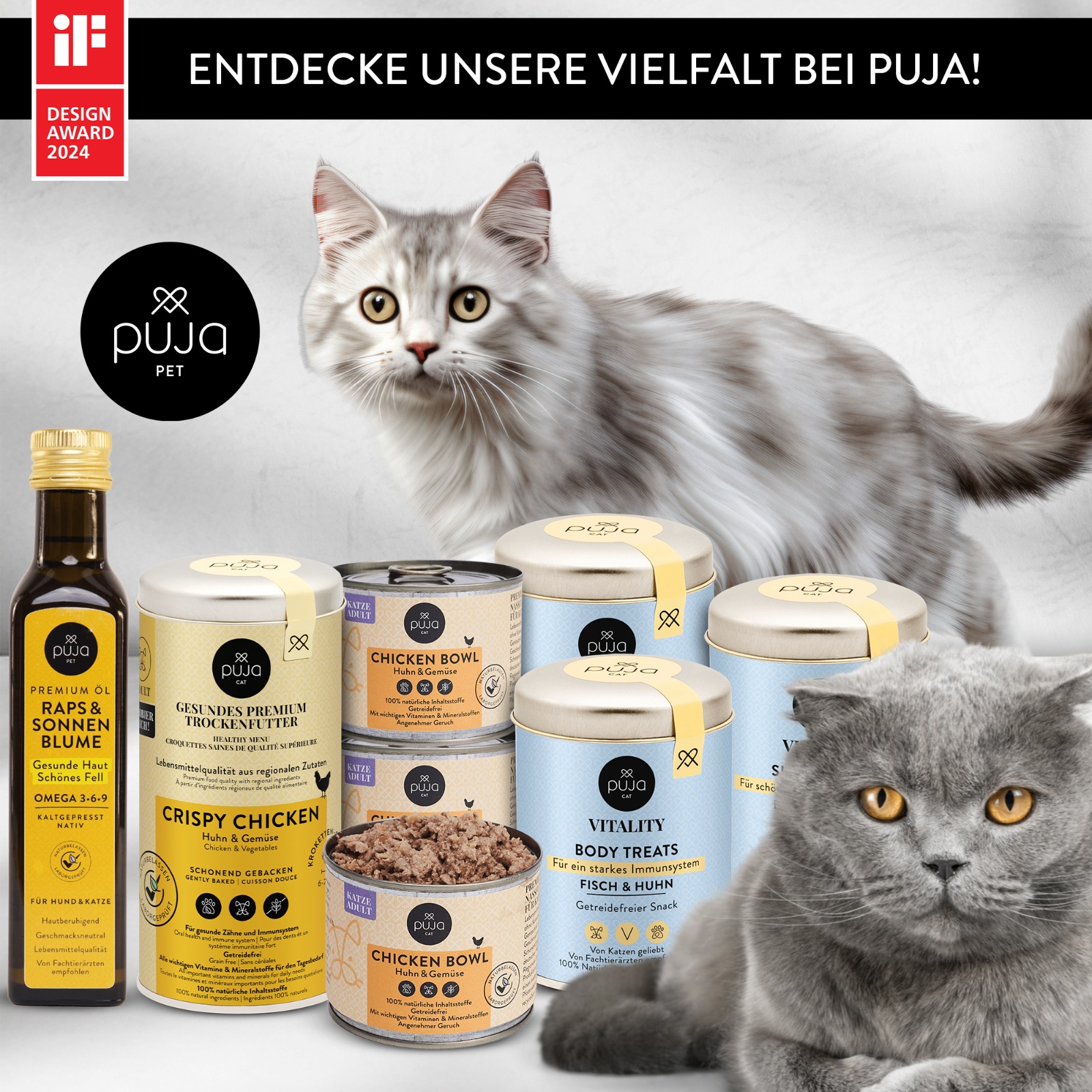 - You want a beautiful coat and healthy skin for your cat? PUJA Vitality Skin is the power package with omega-6 and omega-3 fatty acids such as linoleic acid, linolenic acid, EPA and DHA for your fur paw. In addition, there is the high-performance vitamin biotin - for shiny coat & healthy skin. With vital taurine you support the visual and cardiac function of your cat.
