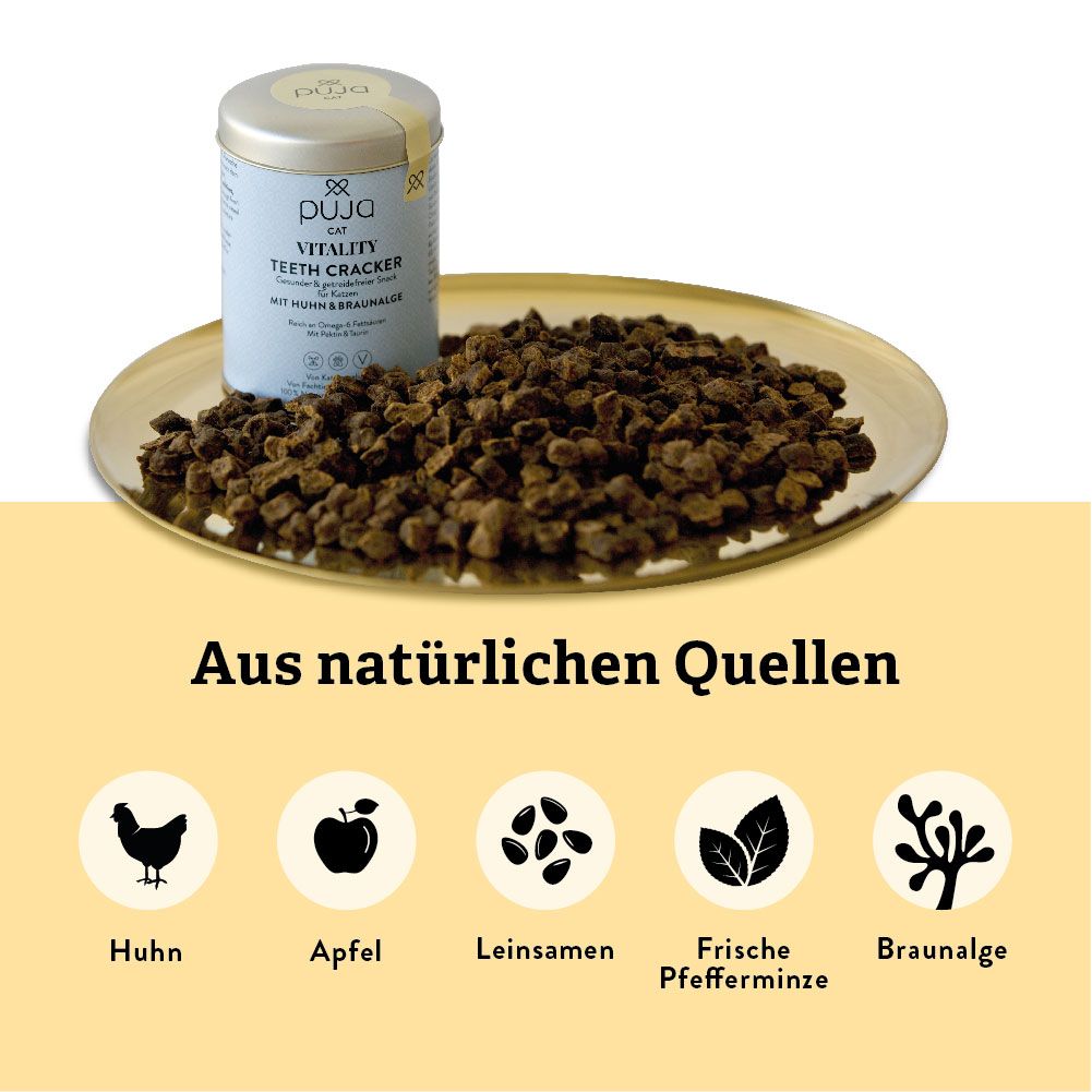 According to the latest studies, brown algae reduces the formation of tartar. Therefore, our PUJA Vitality Teeth Crackers unfold their power already while chewing and contribute with peppermint to a fresh breath of your fur paw.